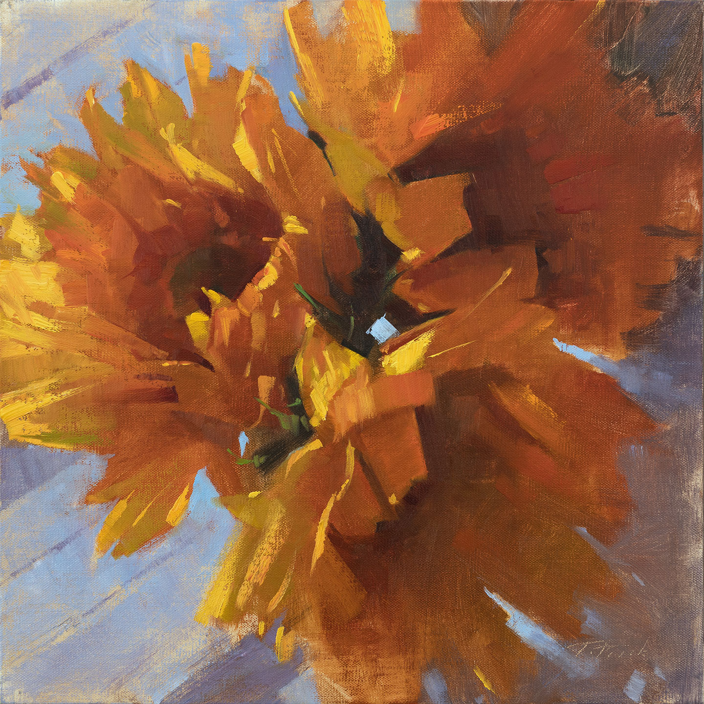 I love the almost tattered look of sunflowers. They are rarely if ever that perfect iconic shape that we drew them as when we were children. Grouping a few of them together suggests the movement of a frenetic dance, and I always feel like I only have a few moments to capture them before the music ends. |