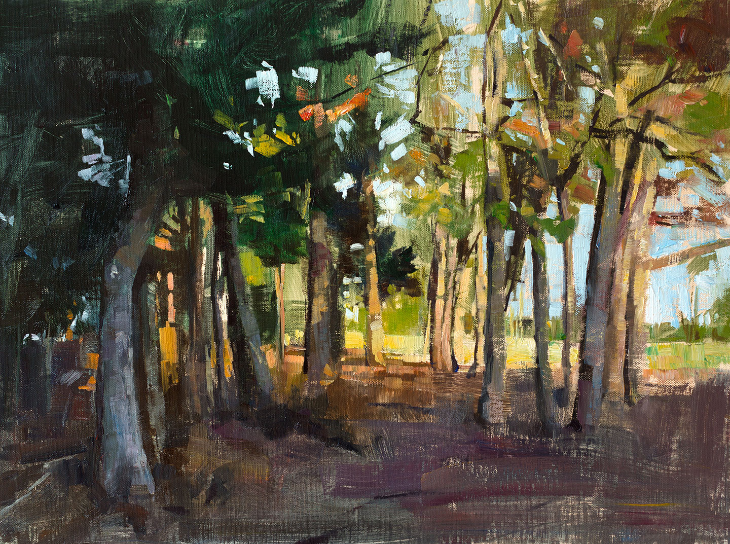 This is a demonstration painting I created during the White River Plein Air Festival in Cotter, Arkansas. I just love the abstract patterns created by trees and the landscape beyond them.